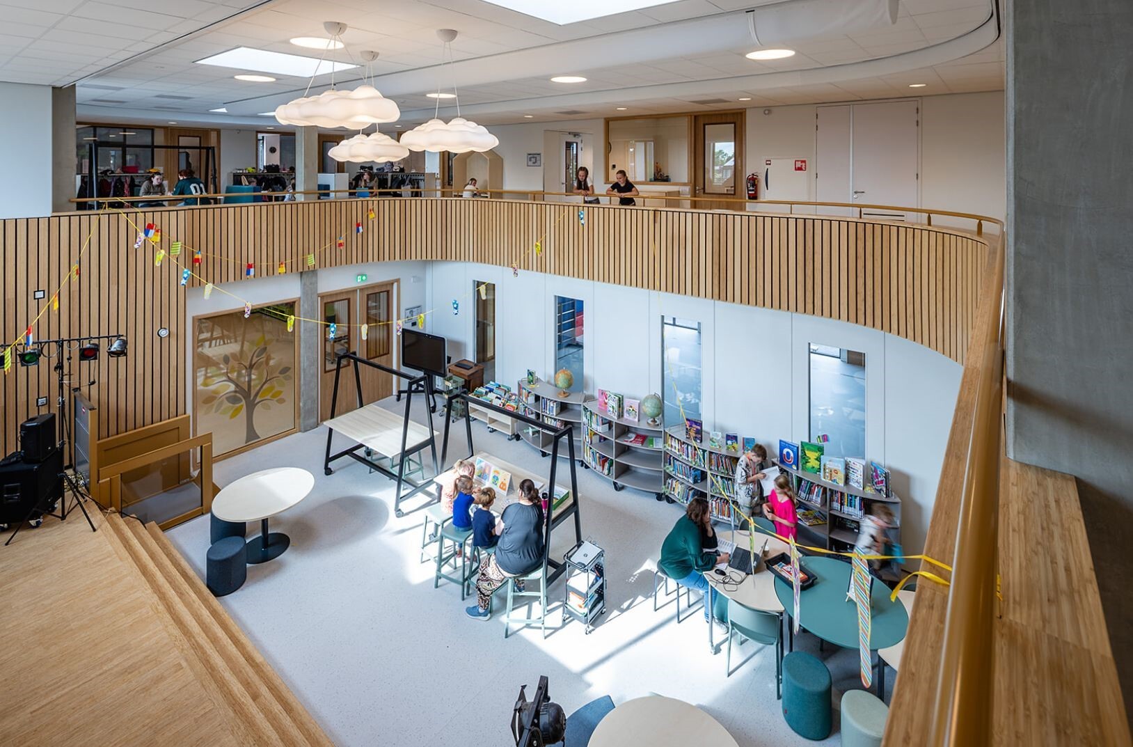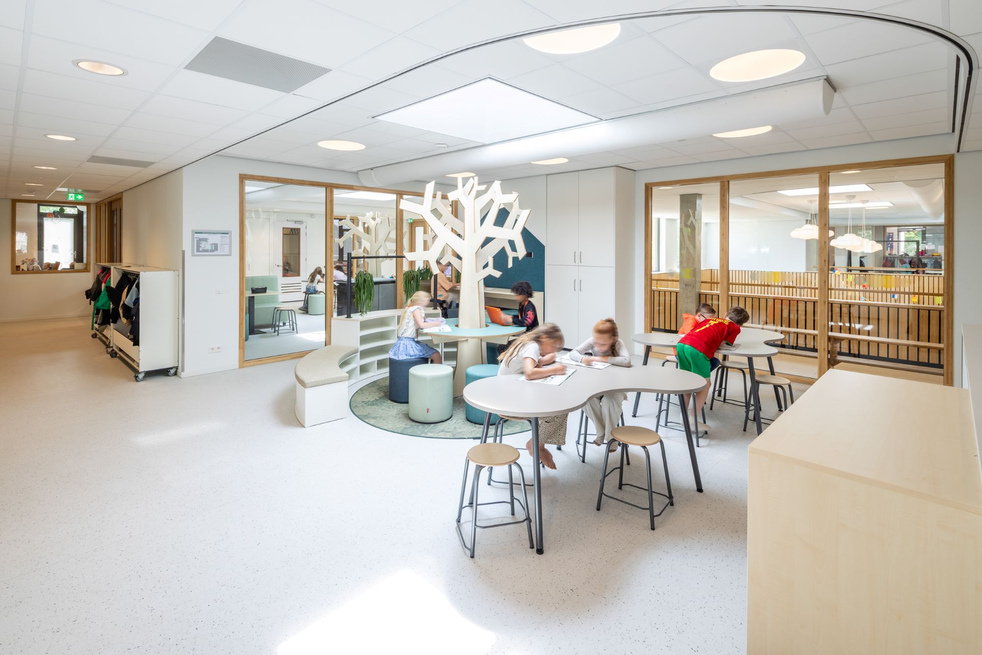 Het integrale kindcentrum biedt uiteindelijk onderdak aan zestien groepen voor onderwijs en vier groepen kinderopvang. Verspreid over het gebouw liggen vijf speel- en leerpleinen. De visie op de doorlopende leerlijn zie je letterlijk terug in het gebouw. De jongste kinderen van nul tot zes jaar zitten beneden. Op de verdieping zijn de groepsruimten voor de kinderen van 7 tot 12 jaar gesitueerd. Een centrale ruimte zorgt voor verbinding tussen onderwijs en kinderopvang. Deze ruimte is uitgerust met een podium, bibliotheek en een multifunctionele kook- en crearuimte. In het centrale hart is ook een uitleenpunt van de bibliotheek opgenomen. “Verbeelding begint immers bij lezen”, volgens de schooldirecteur.