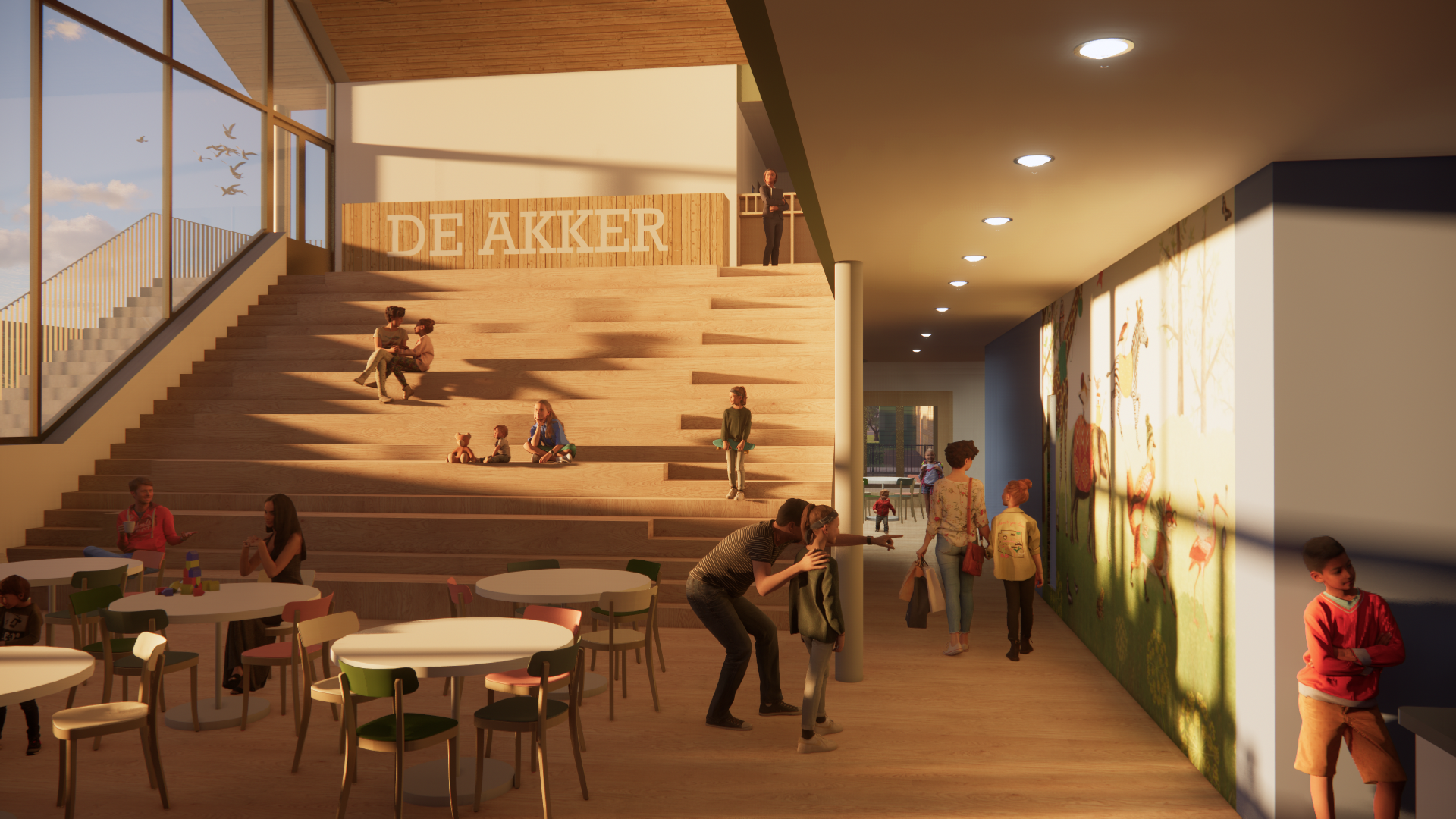De Akker ligt in een rustige jaren 70 wijk. De school krijgt een nieuw onderkomen waarin het compacte Programma van Eisen en de speelsheid van het kind zijn worden gecombineerd met de sobere rust van haar omgeving. Het uiteindelijke resultaat waarnaar we streven: een vriendelijke school voor de buurt.